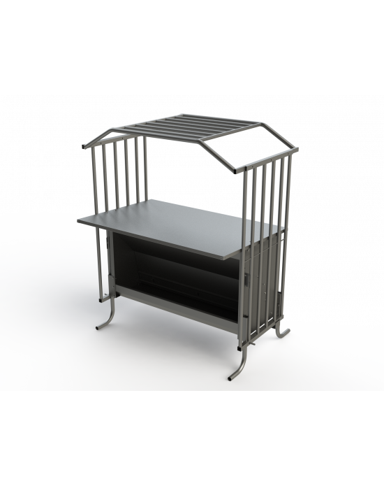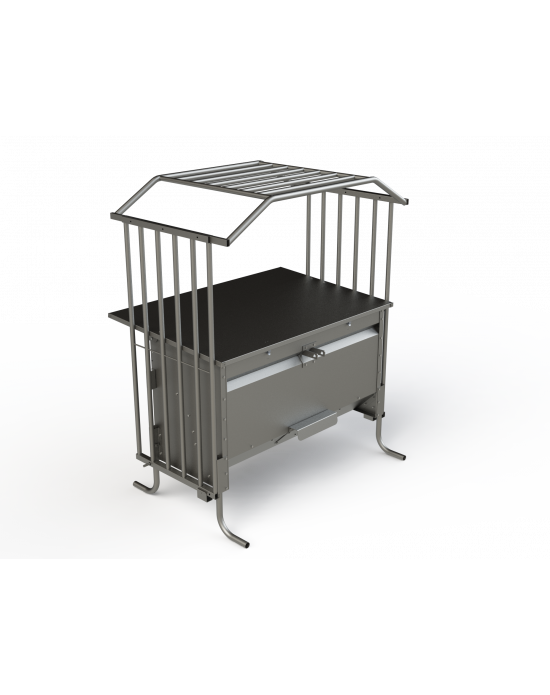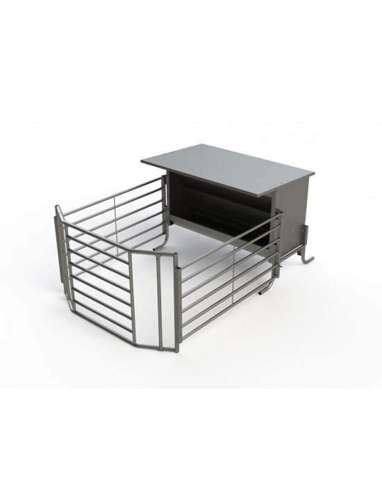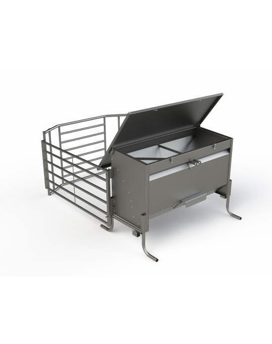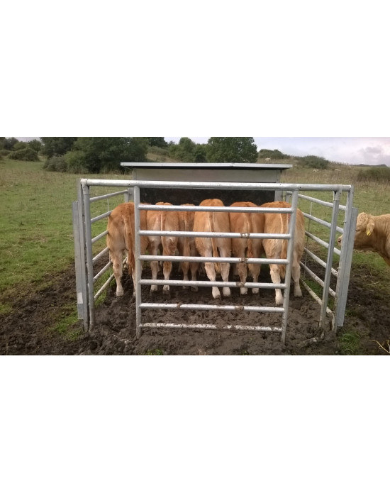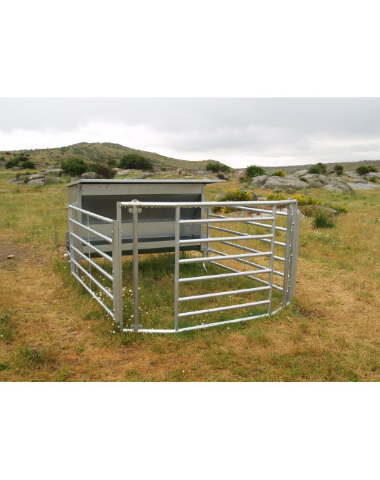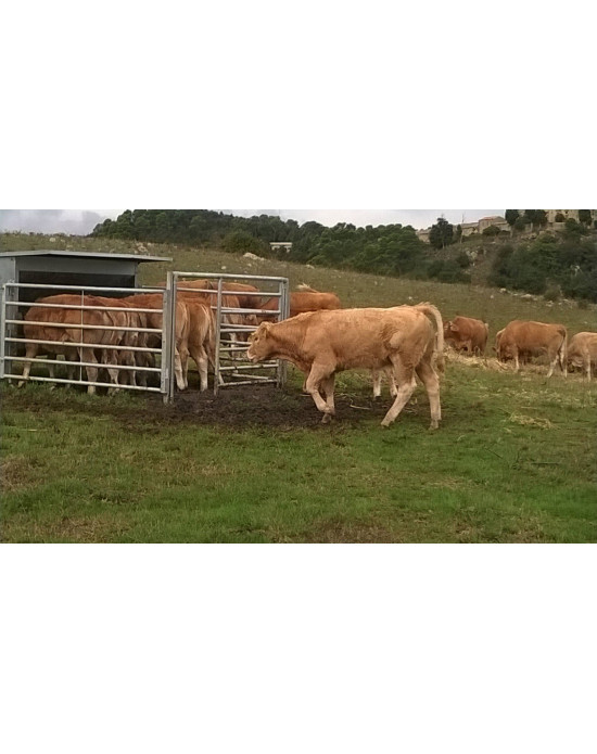 Le corral et les pieds sont fabriqués en tubes galvanisés par immersion à chaud pour augmenter la durabilité. La trémie est équipée d'un attelage qui permet de la transporter facilement avec un tracteur. L'enclos est inclinable pour faciliter le transport et dispose d'une grille pour réguler la sortie des aliments.