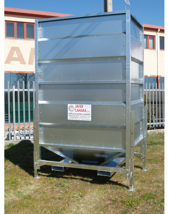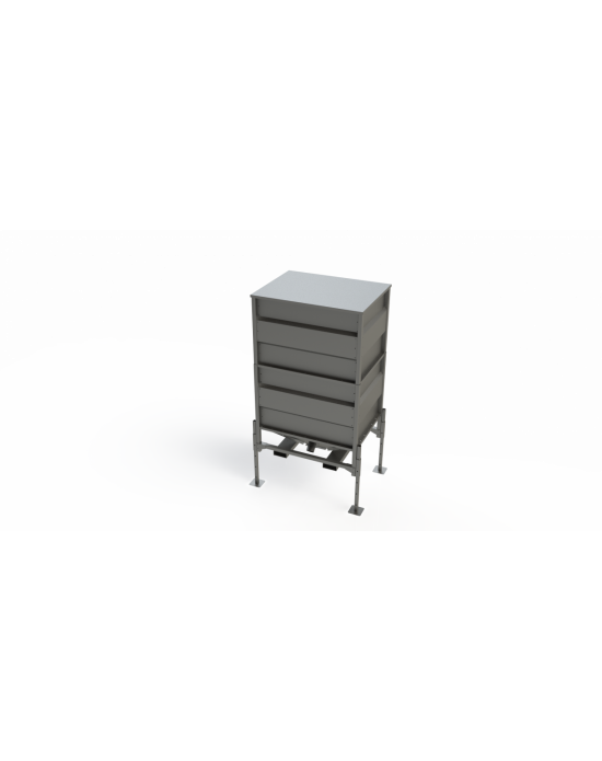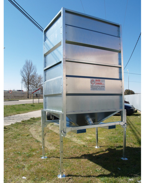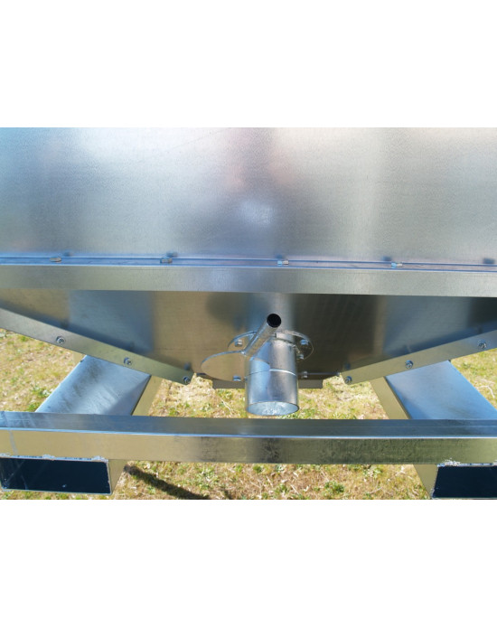 La structure de la trémie est galvanisée à chaud, tandis que le reste est en tôle galvanisée. Les pieds sont réglables en hauteur pour s'adapter aux différents besoins. Elle dispose de deux types de sortie d'alimentation : une glissière au fond et un tube de 110Ø. Il est également conçu pour être facilement transporté à l'aide d'une pelle de tracteur.